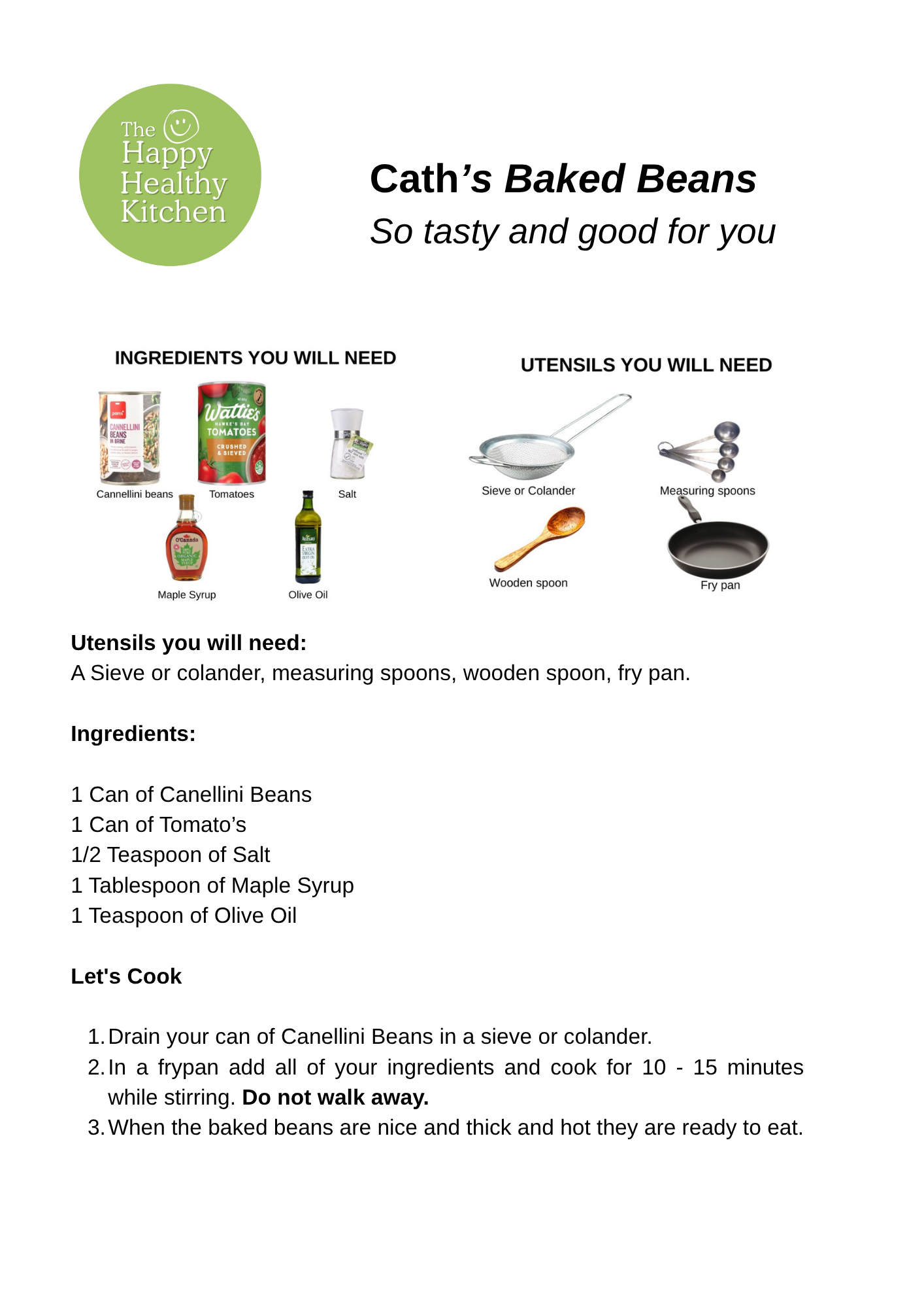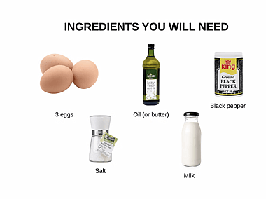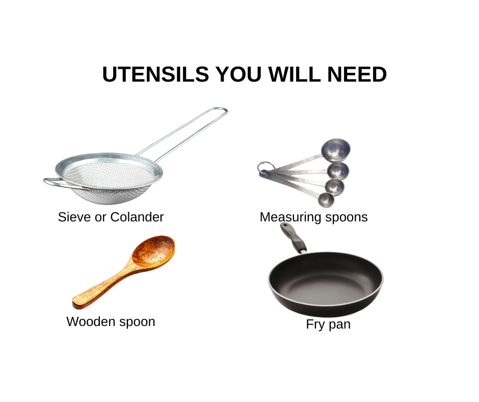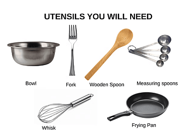 Utensils you will need: A bowl, frying pan, whisk, measuring spoons, fork, wooden spoon